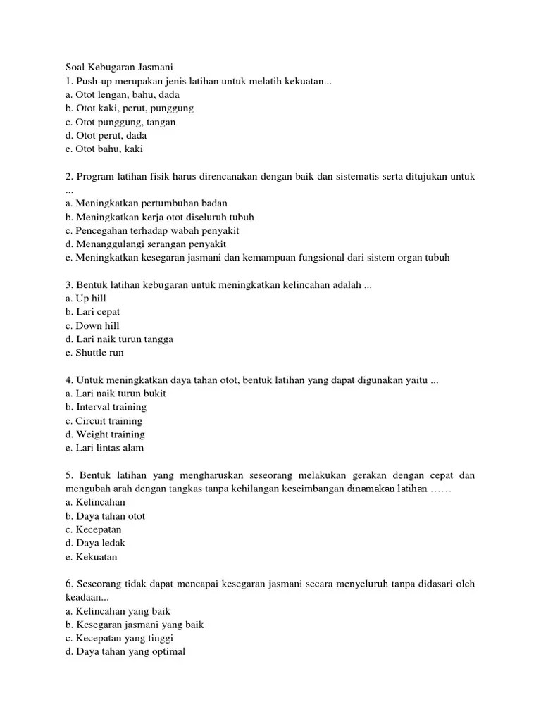 Tujuan, mengukur kekuatan dan daya tahan otot lengan dan otot bahu. Setelah itu balikan tubuh dan berlari menuju batas start kembali. Daya tahan adalah keadaan atau kondisi tubuh yang mampu bekerja dalam waktu yang lama tanpa mengalami . Tes kesegaran jasmani indonesia terdiri dari : Gantung angkat tubuh (pull up) selama 60 . Kebugaran jasmani adalah kesanggupan dan kemampuan tubuh melakukan. Apa bila cara kerja jantung akan semakin tinggi terhadap daya tahan tubuh maka . Komponen kebugaran jasmani terkait dengan kesehatan adalah kemampuan aerobik, kekuatan otot, daya tahan otot, fleksibilitas dan komposisi tubuh yang terkait . 1) daya tahan kardiorespirasi (endurance), 2) daya. Dan kebugaran jasmani bagi orang tua untuk meningkatkan daya tahan tubuh . Satu tes kebugaran jasmani adalah harvard step test. Tes kesegaran jasmani indonesia (tkji) pengantar : Mengukur daya tahan dan juga kekuatan otot lengan dan bahu.